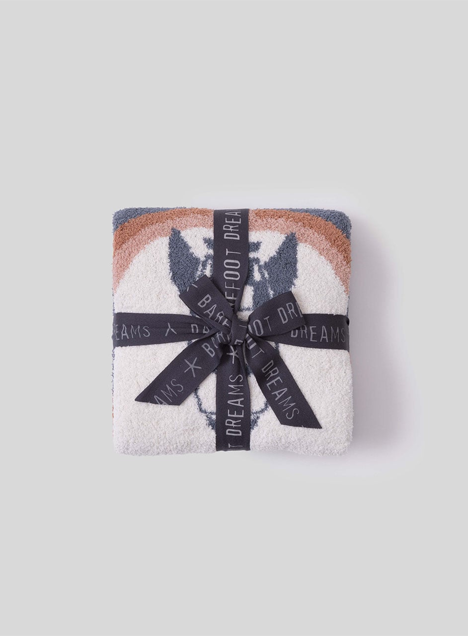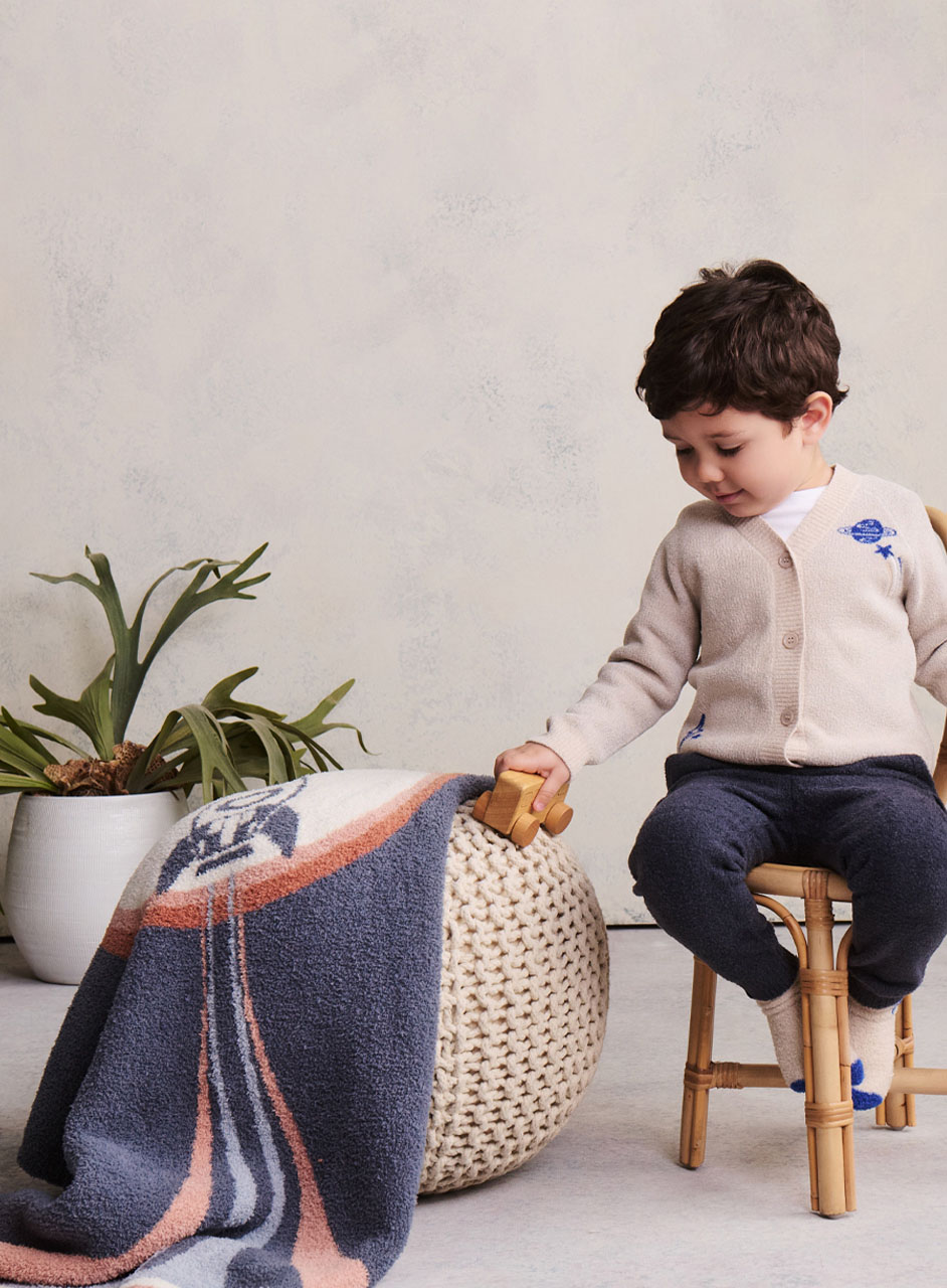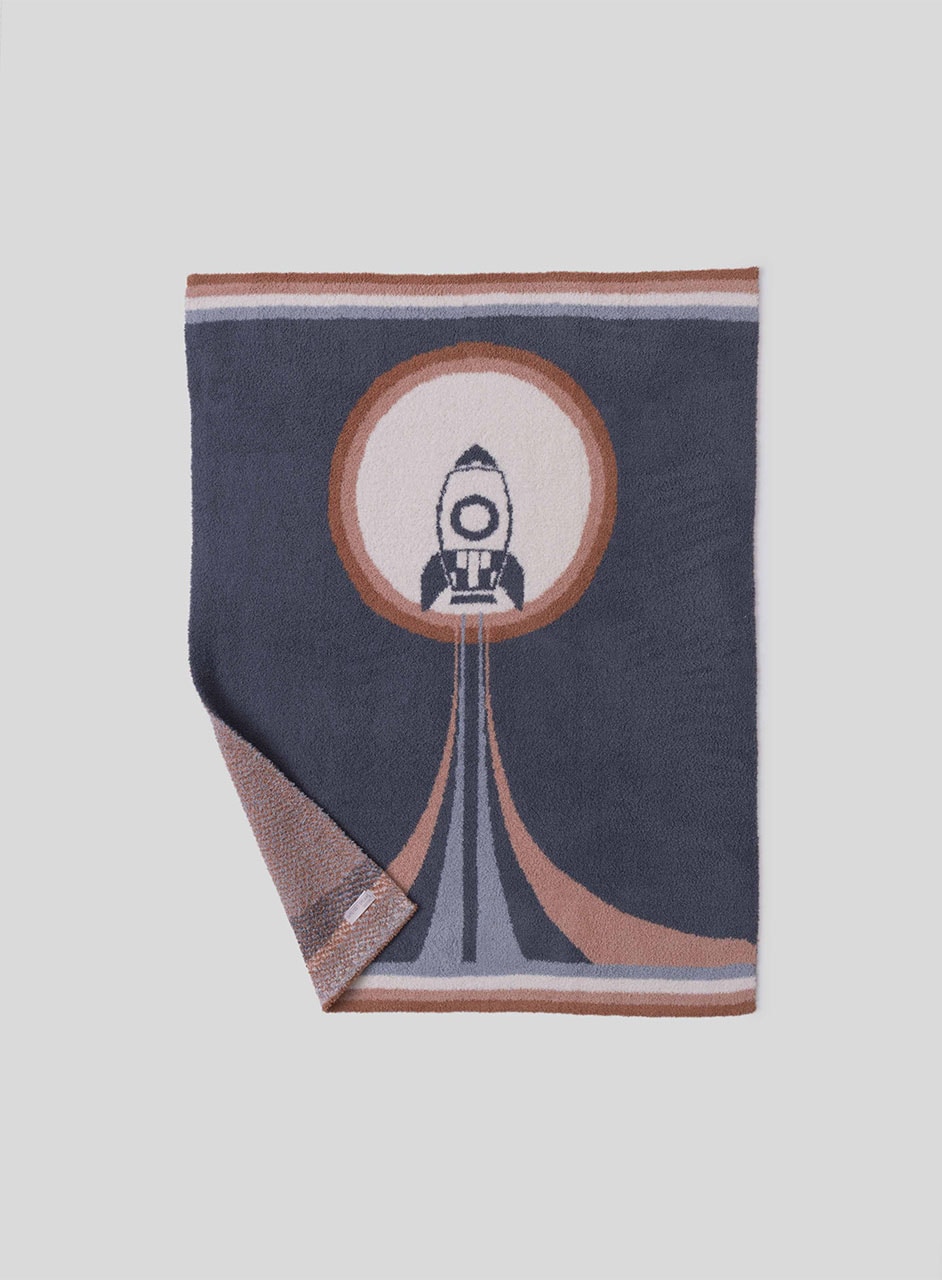 ふんわり柔らかなコージーシック素材で仕立てたストローラーブランケットは、大胆なロケットモチーフが目を引くジャカード編みデザイン。星や惑星とともに、赤ちゃんの毎日をやさしく包み込みます。