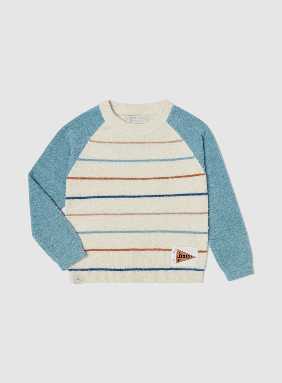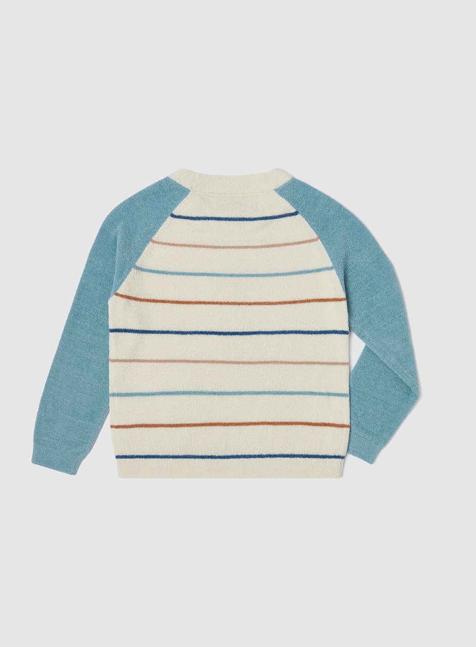 カラフルなマルチストライプのボディと、コントラストの効いた無地のラグランスリーブを組み合わせ、遊び心のあるデザインに仕上げました。