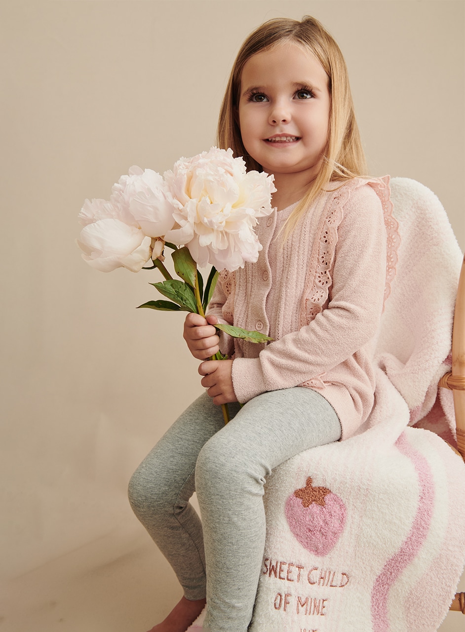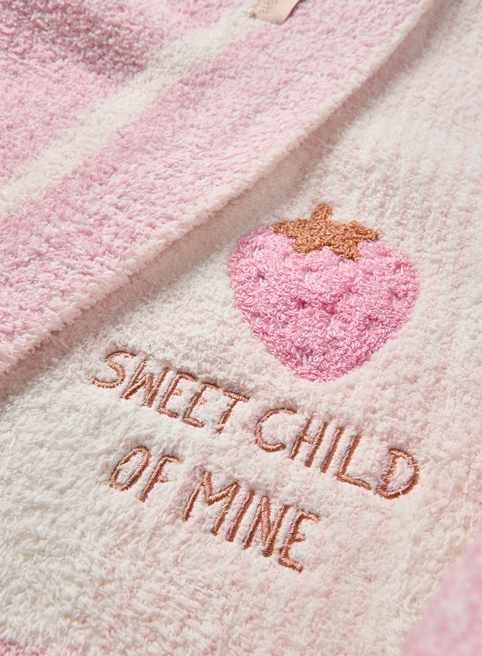 「SWEET CHILD OF MINE」という愛らしいフレーズの刺繍に加え、ふっくらとしたループ刺繍で表現したストロベリーモチーフをあしらい、思わず触れたくなるテクスチャーと可愛らしさをプラスしています。