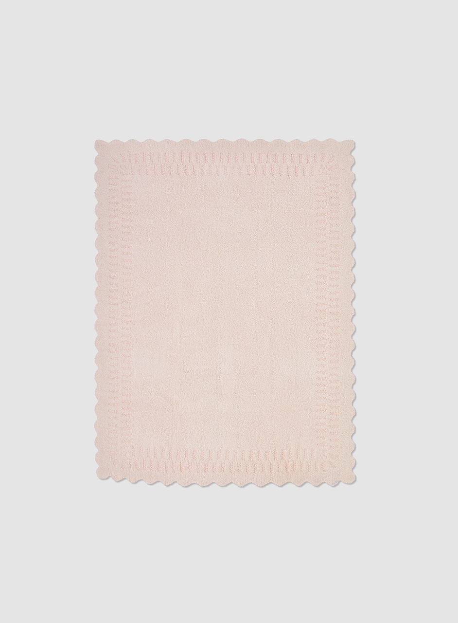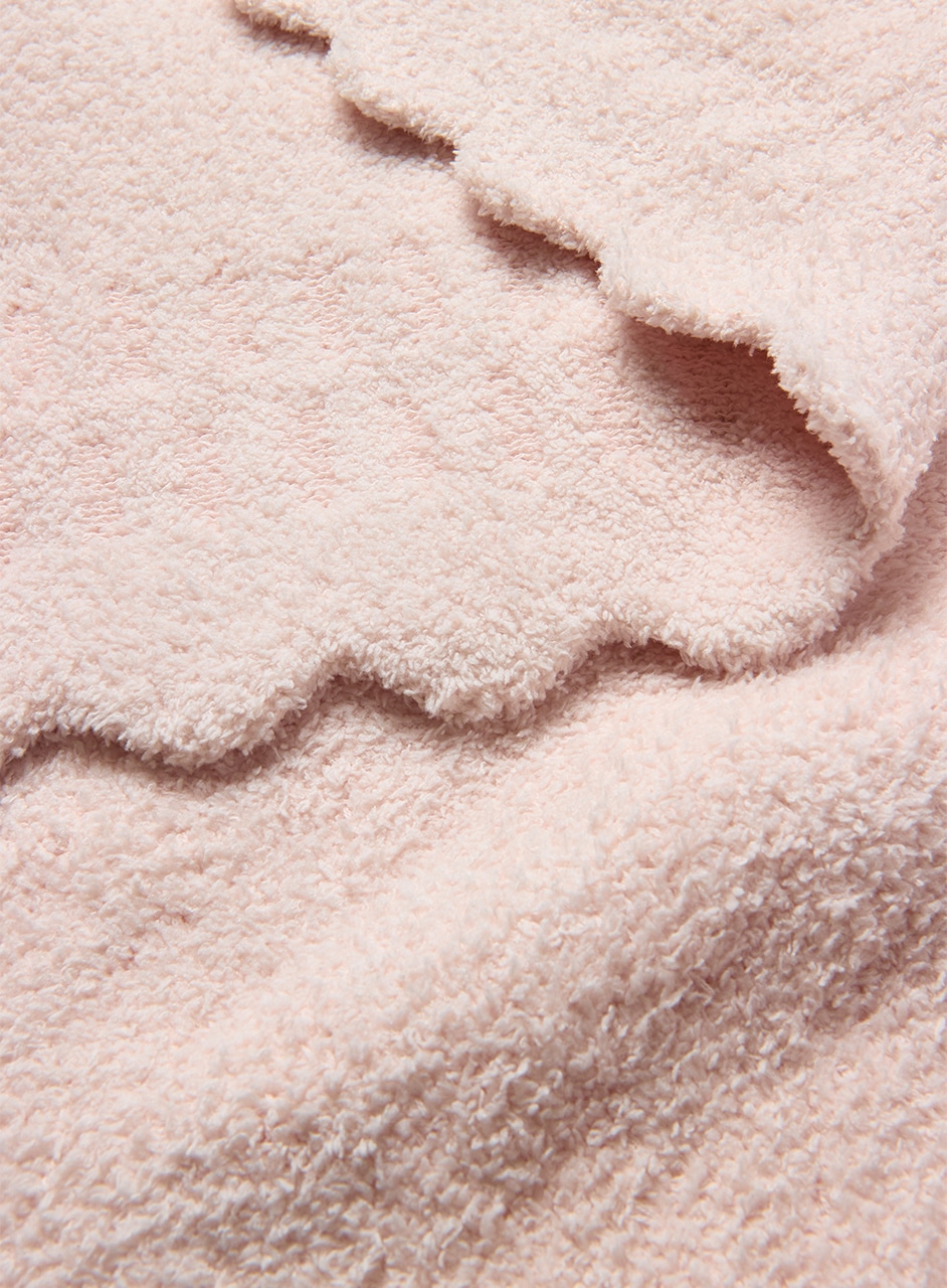 ふんわりとしたコットンブレンドの編地に、立体的なテクスチャーと、波打つようなスカラップエッジが施された、愛らしいデザインです。