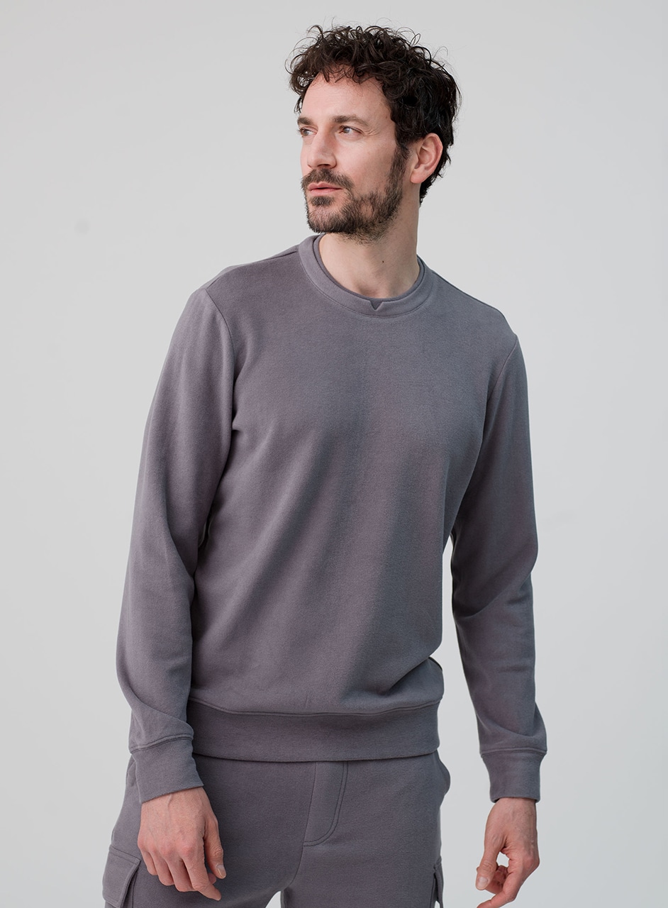 柔らかいフリース素材に、ダブルネックバンドのディテールが特徴的なプルオーバー。
