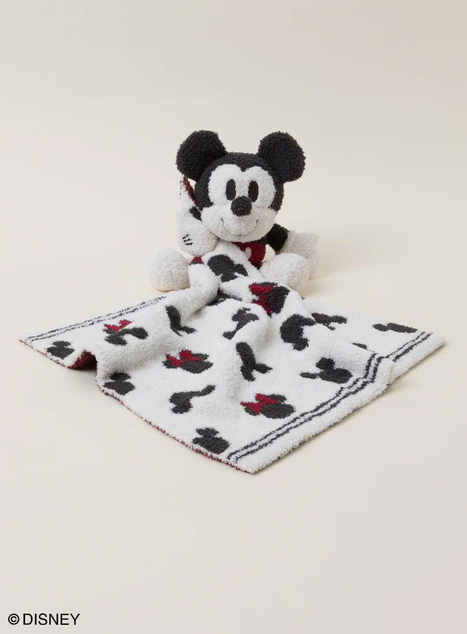 愛らしいぬいぐるみにミッキーとミニーの総柄が描かれた柔らかなブランケットは、