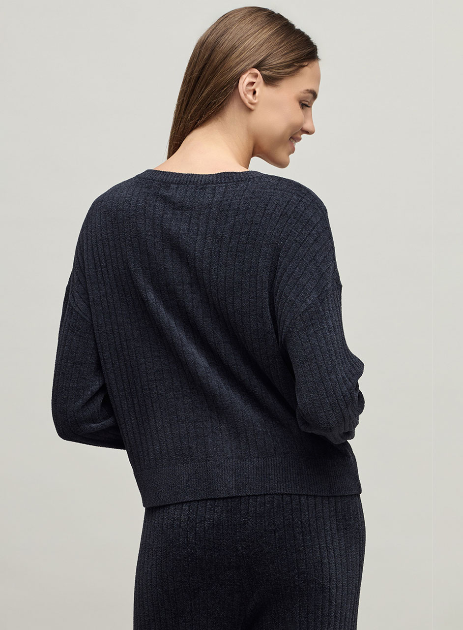 全体に施したリブ編みのテクスチャーに、袖口上部にはさりげないバリエーションピンチシームディテールをあしらい、心地よさの中に繊細な表情を添えています。
