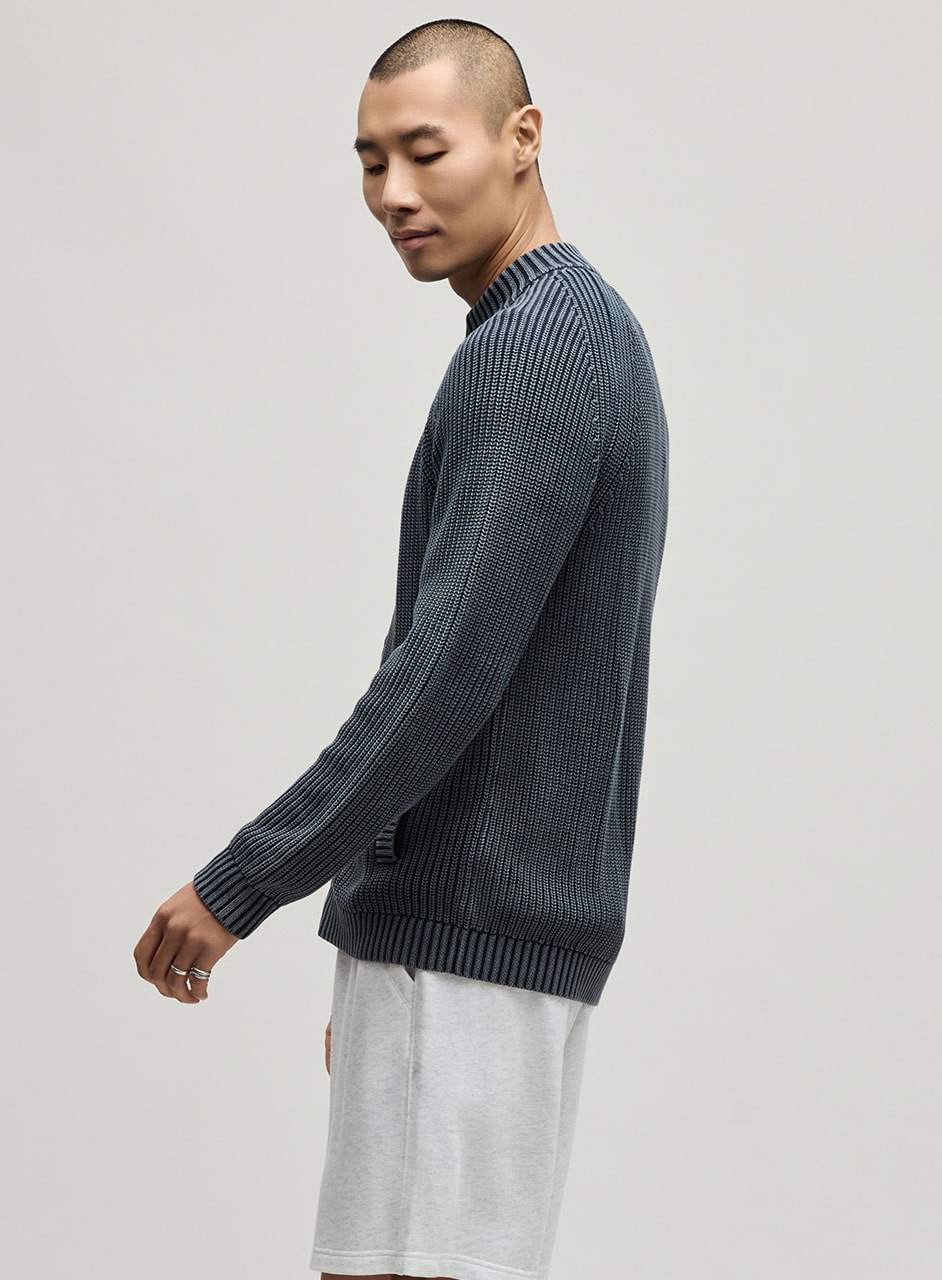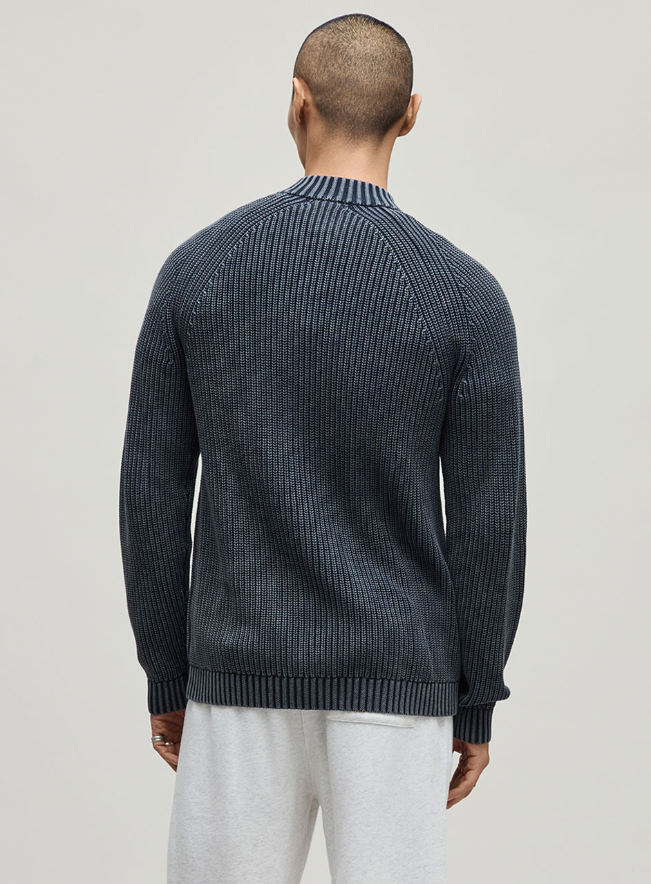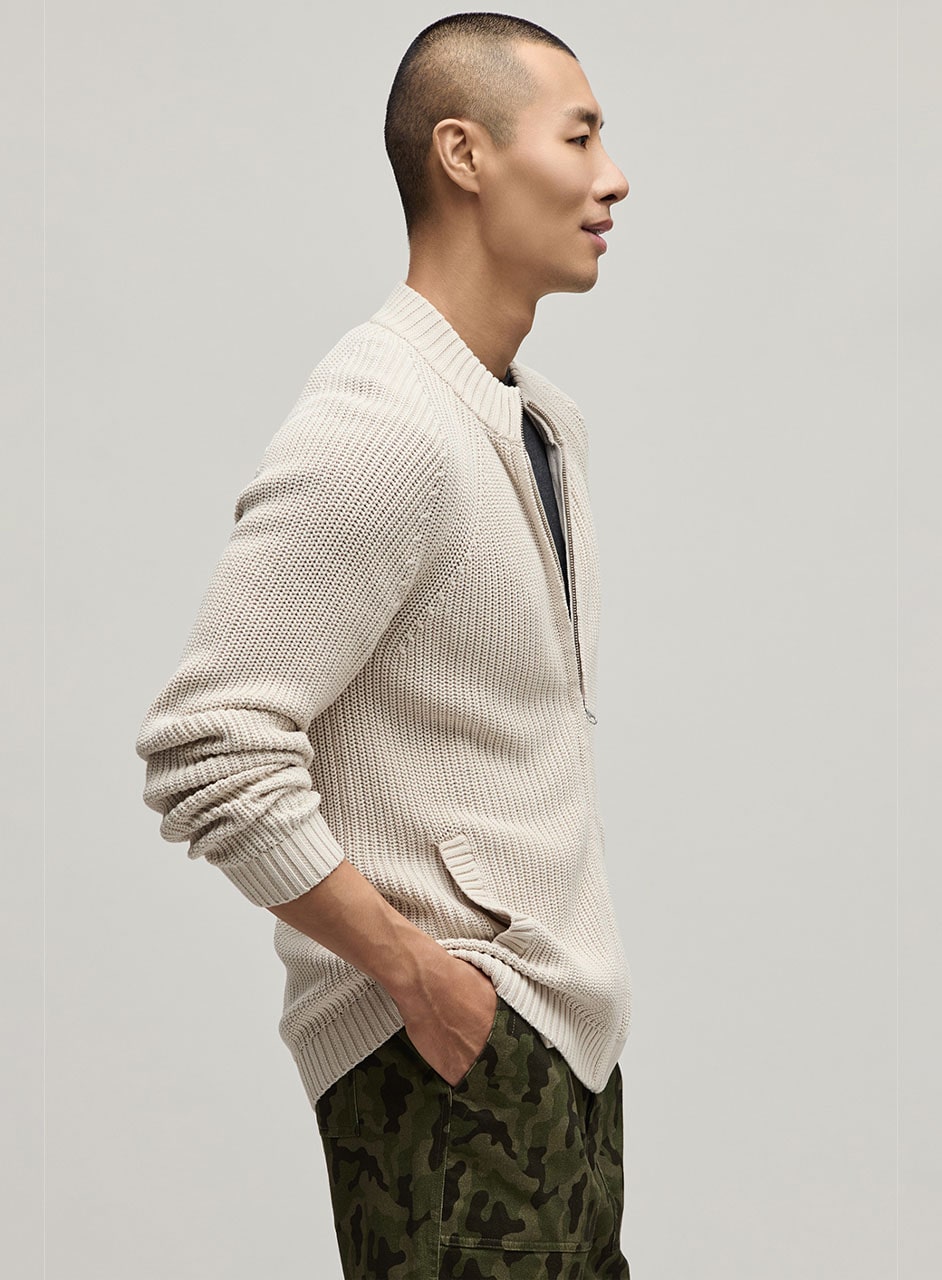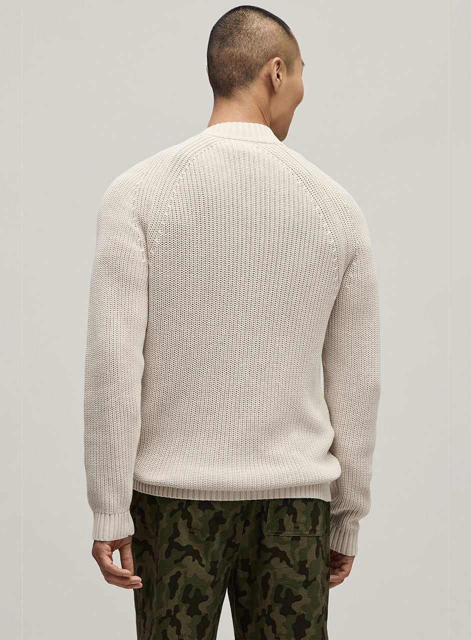 ラグランスリーブのクルーネックシルエットに、フロントフルジップ仕様を組み合わせ、スタイリングに取り入れやすいベーシックな佇まいに。