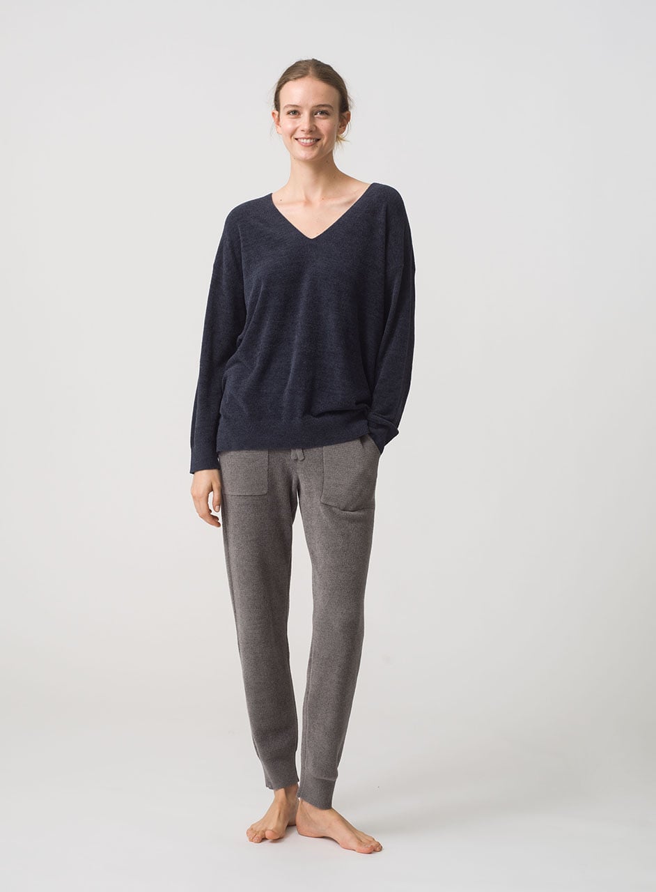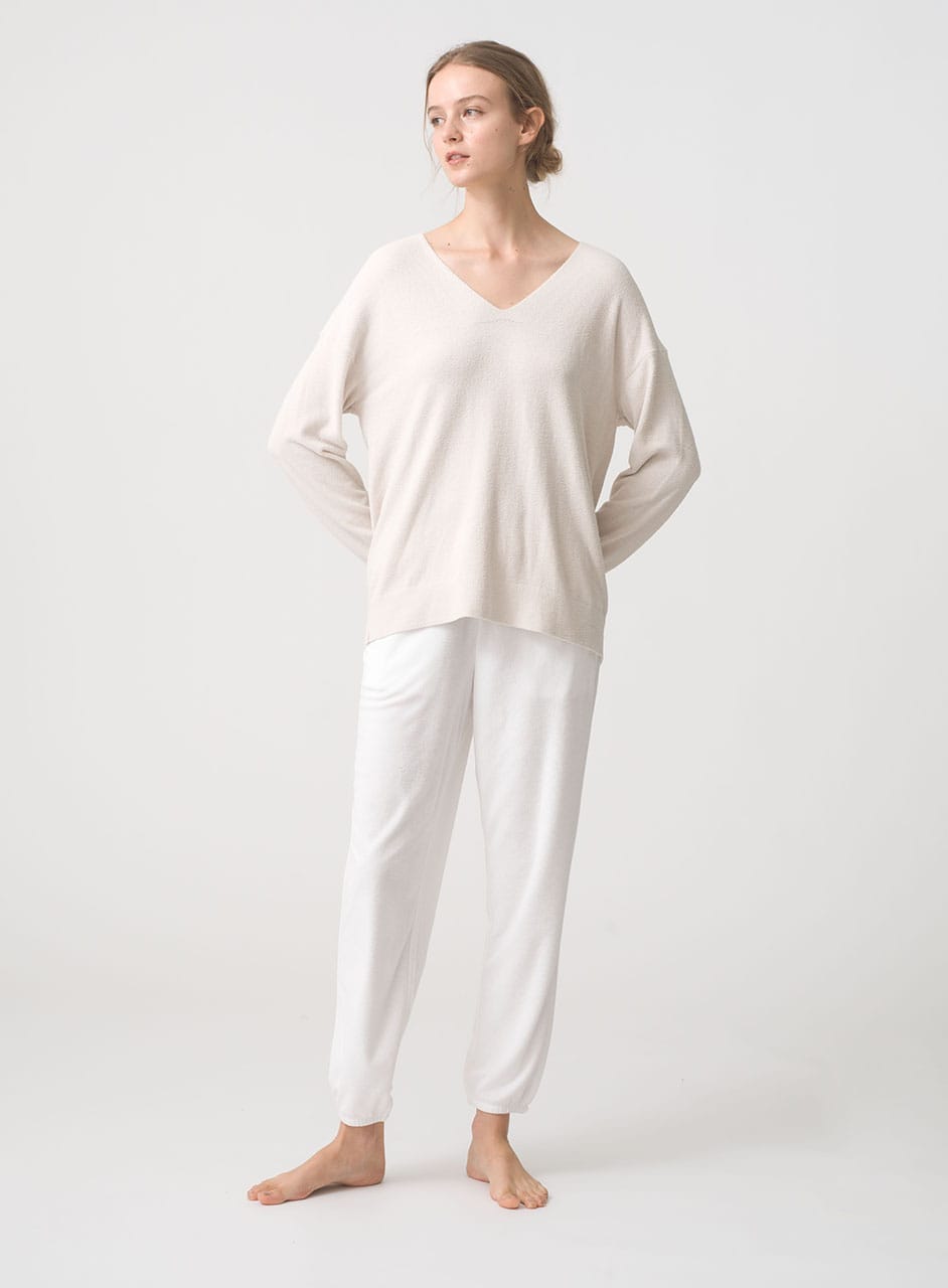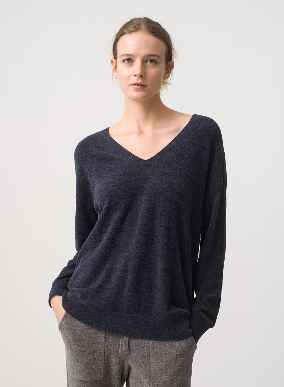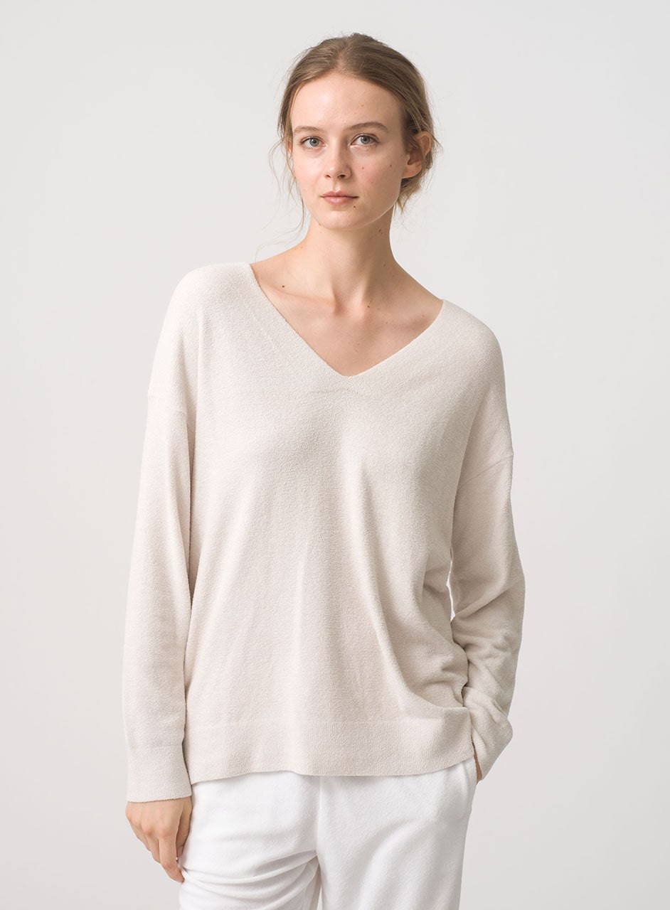 Vネックとドロップショルダーがリラックスした雰囲気のプルオーバー。