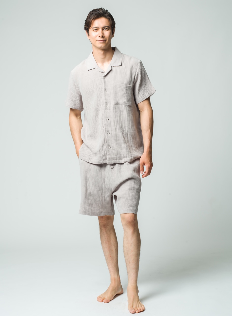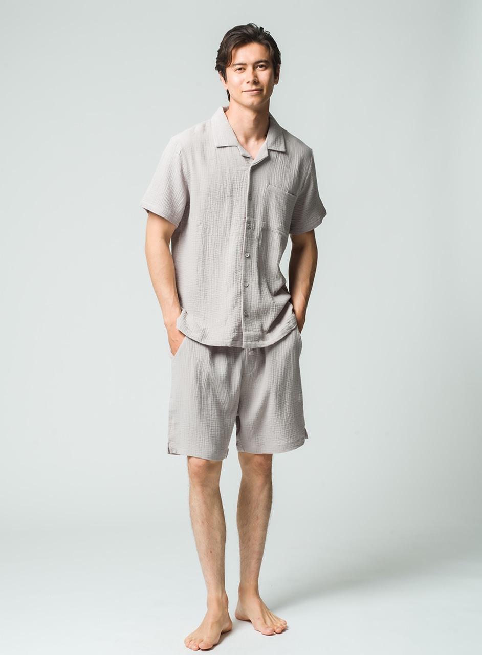 抜け感のあるオープンカラーがリラックスした雰囲気を演出。