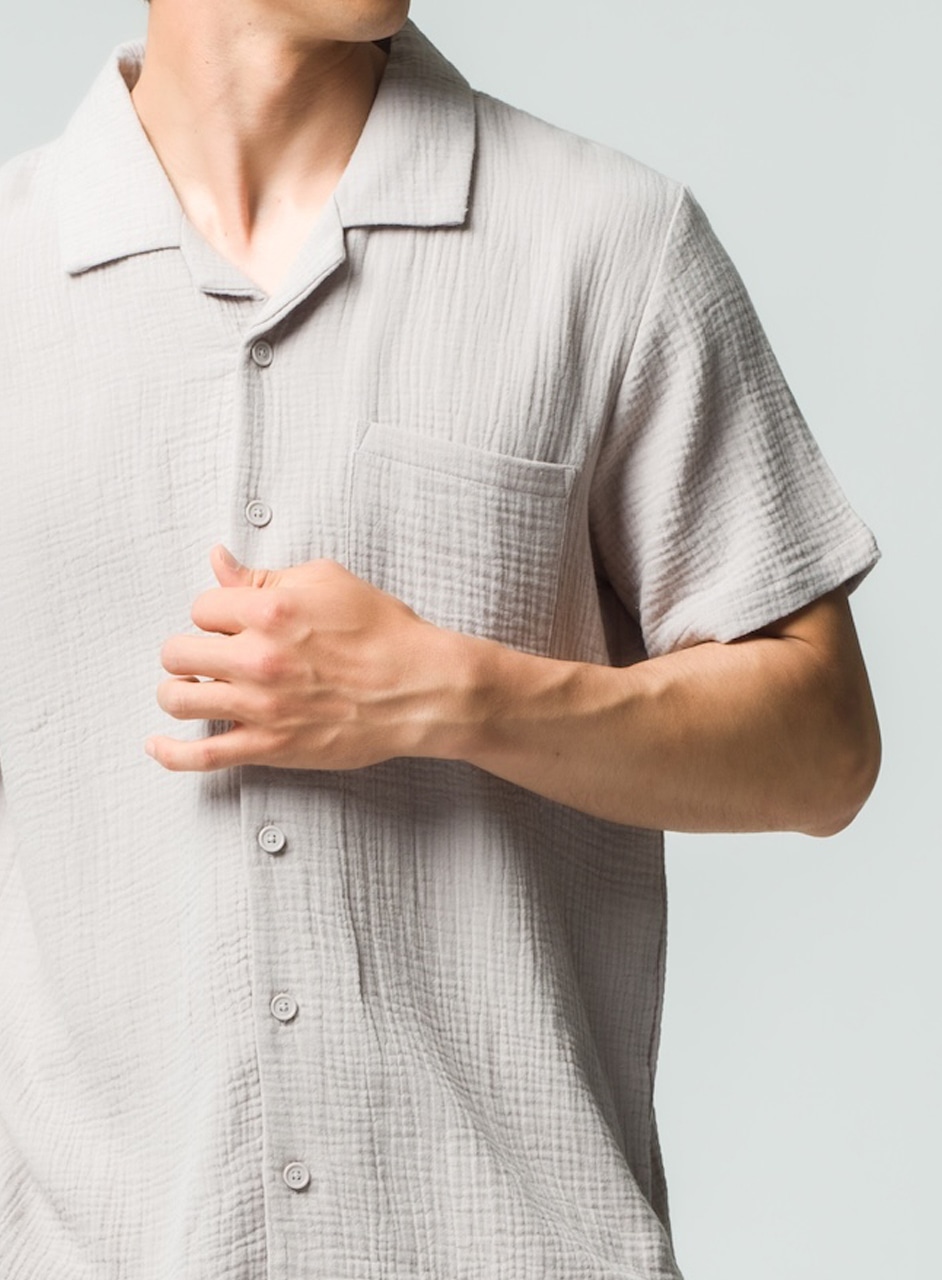 独特な風合いを楽しめるガーメントダイ(染料染め)生地で作られたシャツ。