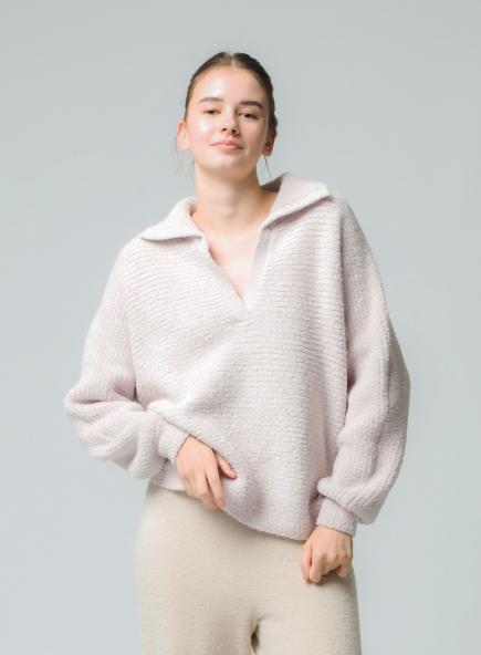 リラクシーな雰囲気がありながらも、襟元のリブ使いが上品な印象に。
