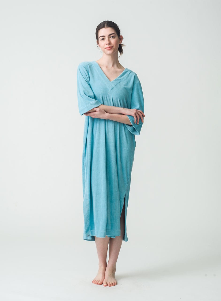 前後のVネックが品のある女性らしさを引き立て、サイドスリットが軽やかな動きを演出します。
